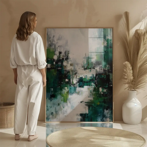 Bring bold sophistication to your space with this emerald green abstract wall art available as a print to frame or framed ready to hang. Featuring rich textured brushstrokes in deep green, white, and black tones, this modern large abstractpainting print adds a striking touch to minimalist or contemporary interiors.