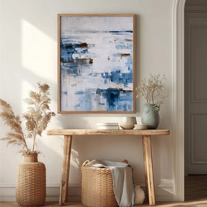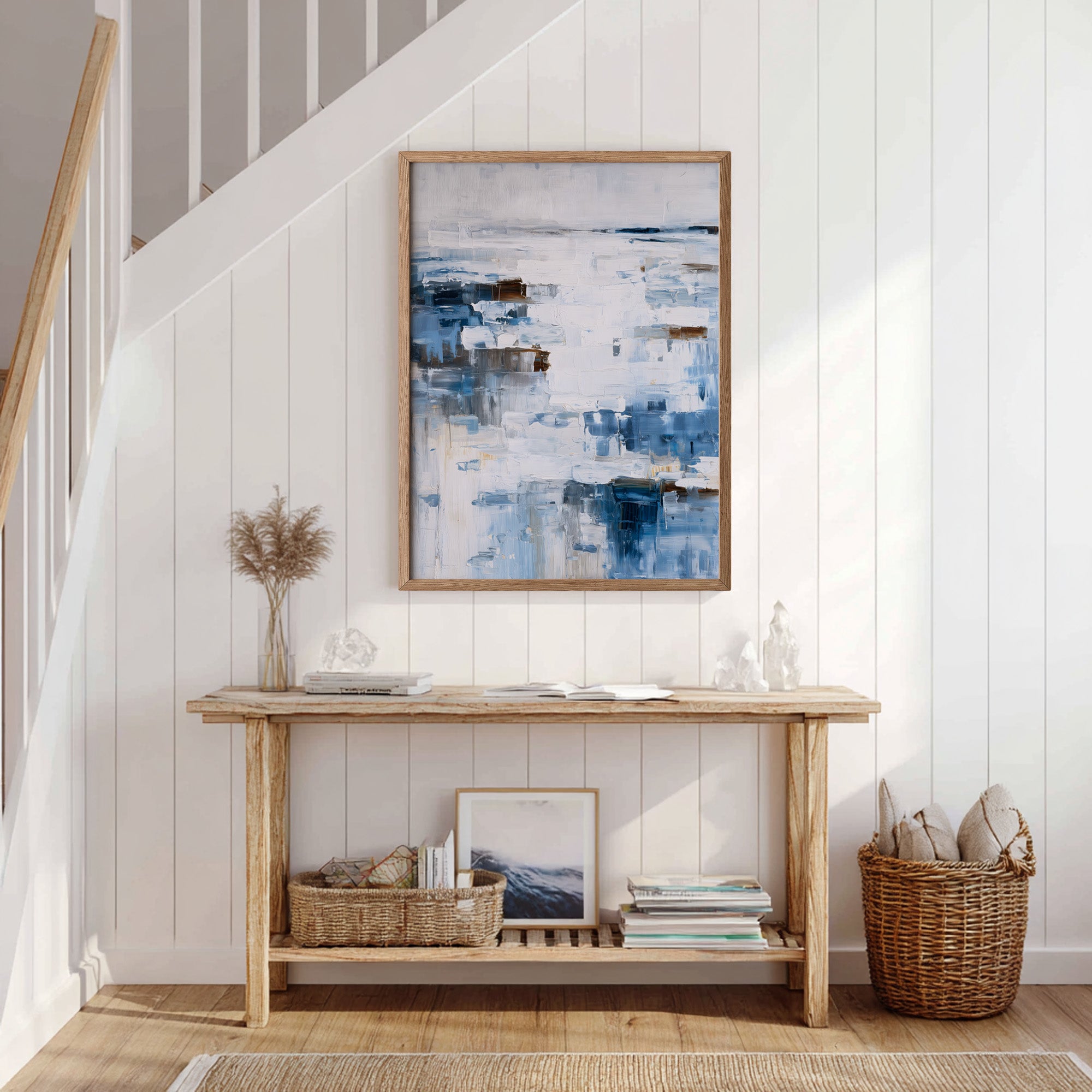 A serene coastal-inspired abstract artwork featuring textured layers of soft whites, ocean blues, and earthy tones. This modern piece adds a tranquil, sophisticated touch to any contemporary or beach-style interior. Perfect for creating a calm and stylish atmosphere.