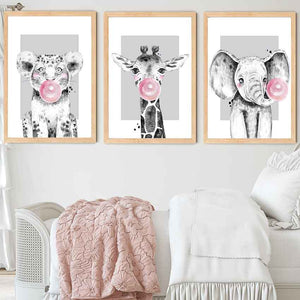 A set of three fun Safari Baby animal wall art prints perfect for little girl's. Animals blowing  pink pastel bubbles with customised back ground colour possible to suit any décor.