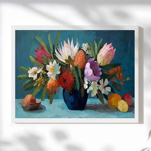 Celebrate the vibrant beauty of Australian flora with this botanical wall art print. Featuring native flowers like banksia, protea, and waratah in a painterly still-life composition, it’s a bold and elegant piece perfect for nature lovers, modern interiors, or Australiana-inspired decor.