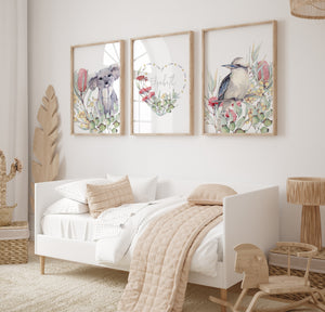 Bring a touch of down-under to your little girl's nursery with these beautiful, customisable Australian Watercolour animals wall prints.