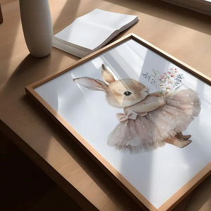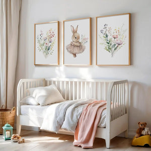 Transform your child’s nursery with the Bunny Wall Art Nursery Prints trio. Featuring a sweet bunny dressed in a tutu and clutching a bouquet of wildflowers, these prints bring a gentle charm and whimsical elegance to the room. Perfect for creating a cozy, inviting atmosphere, they add a delightful touch that nurtures imagination and warmth.