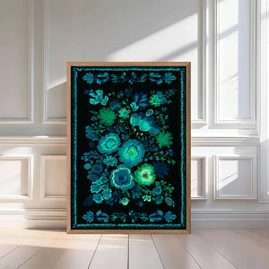 A bold Mexican folk art print featuring black and green floral design. Graphic, elegant, and perfect for adding character to modern or eclectic interiors.