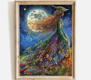 Embrace a little magic with the Witchy Wildflower Witch Wall Art print. Featuring a mystical wildflower witch basking under a full moon, this print adds a touch of enchantment to any space. Perfect for those who want to bring some whimsy into their home decor!