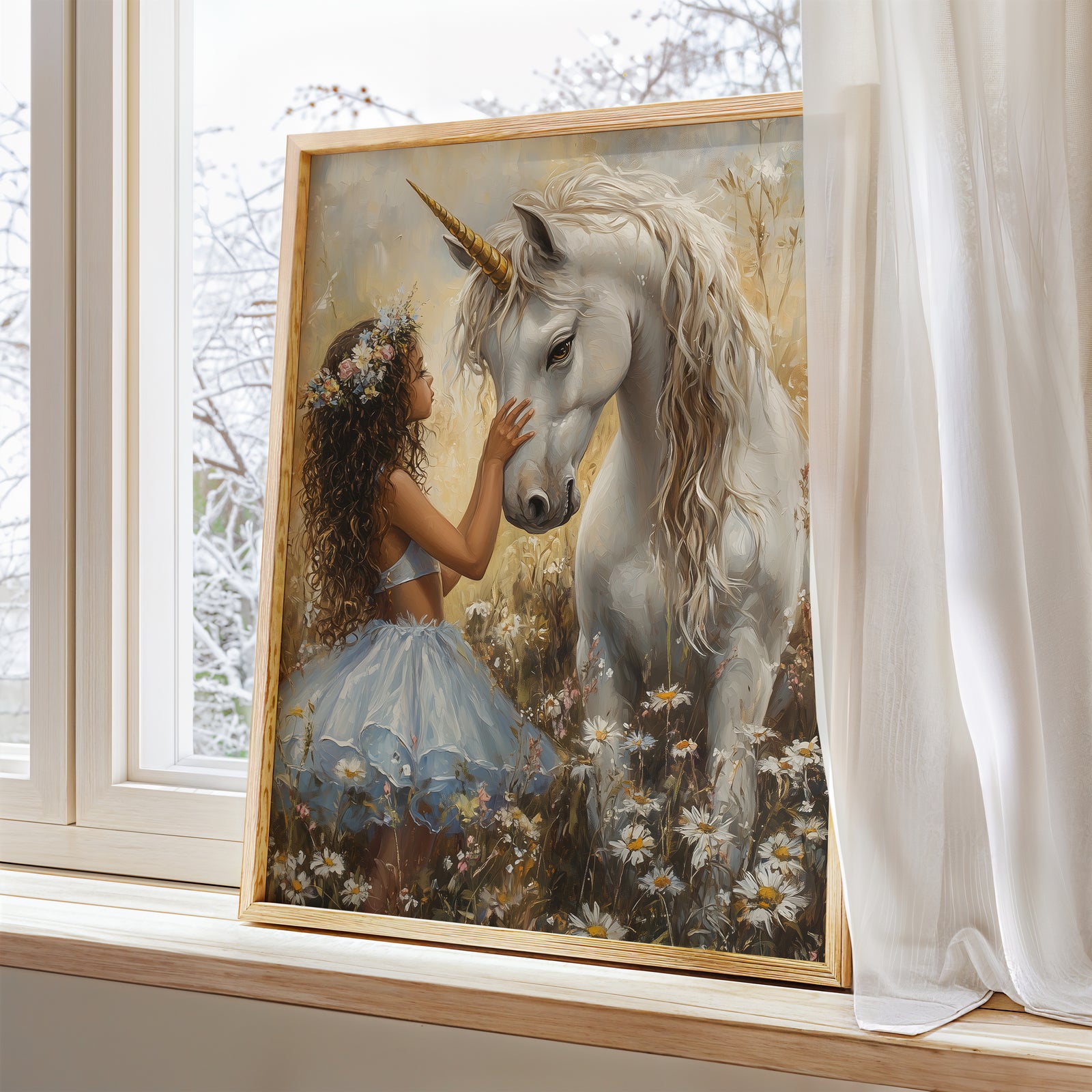Discover our featured print from our enchanting collection of unicorn prints for girls, featuring artwork that captures magical moments. From girls hugging their unicorn companions to dreamy wildflower fields, each piece brings warmth, imagination, and a gentle charm to any nursery or bedroom. Perfect for creating a space full of wonder and heartfelt beauty. Bring the artwork to life in your space — available as unframed prints or thoughtfully framed in oak, black, or white for a timeless finish.