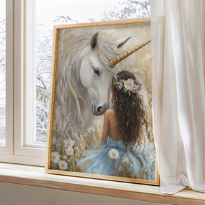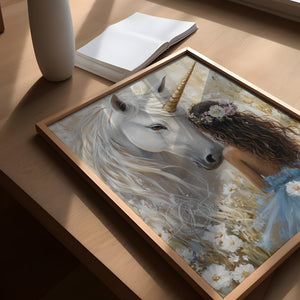 Add a touch of magic to your little one's room with our Enchanting Unicorn wall art. This original piece features a charming girl and her trusty unicorn in a field of beautiful flowers. Let their imaginations run wild with the perfect addition to any girl's wall.