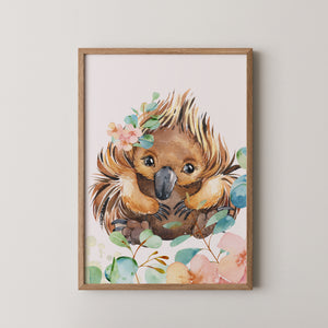 Decorate your baby girl’s nursery with this charming set of three Australian baby animal prints. Each print features a koala, kangaroo, or echidna surrounded by eucalyptus leaves and delicate peach florals.