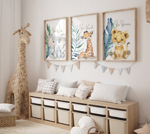 A set of three Safari baby anima wall prints featuring our beautiful Safari Baby's set  in Indigo Blue tropical leaves. Perfect addition to the nursery or bedroom.