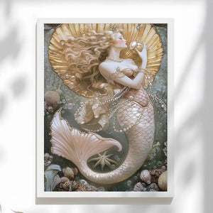 Bring the magic of the sea into your space with this stunning mermaid wall art print, featuring an ethereal blonde mermaid surrounded by shimmering pearls, delicate seashells, and ocean treasures.