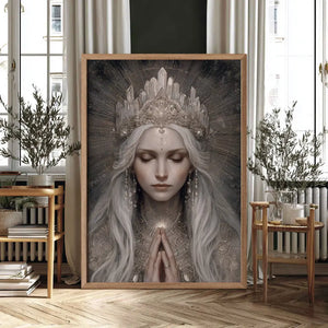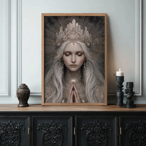 Elevate your space with this divine feminine goddess art print, featuring a serene woman wearing a crystal crown with hands in prayer. This spiritual, boho-inspired artwork brings calming energy and sacred feminine beauty to any room. Perfect for meditation spaces, self-care corners, or gifting to someone who loves spiritual decor.