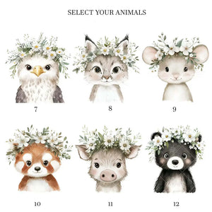 This baby animal nursery print collection is designed for girls’ nurseries and features gentle woodland animals adorned with delicate floral headdresses. Illustrated in soft, calming tones, these prints create a warm and feminine feel that works beautifully in modern nursery spaces.