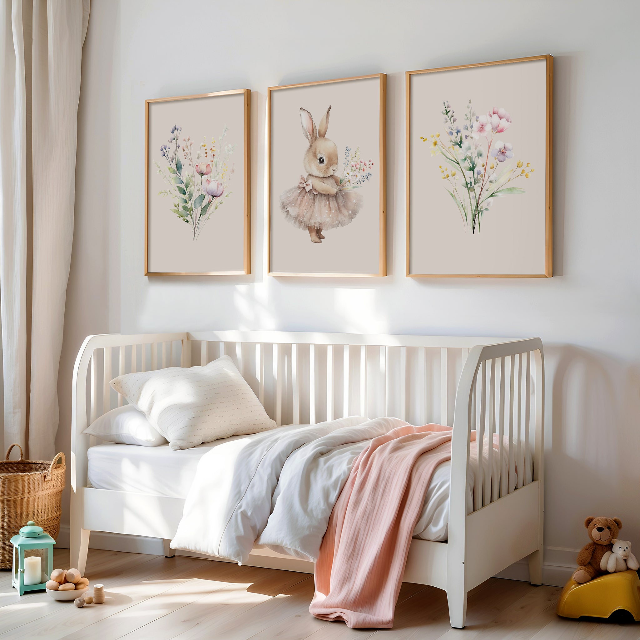 This whimsical bunny nursery wall art set of three brings a soft, playful charm to nursery and children’s spaces. Featuring a sweet bunny in a delicate tutu paired with two coordinating floral prints, this set creates a gentle and cohesive look designed to grow beautifully with your child.