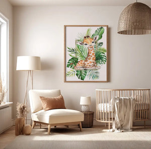 Tall and playful, this Safari Giraffe Jungle Print brings a touch of tropical adventure to any kids’ nursery or jungle-themed room. Perfect on its own or as part of the Tropical Green Safari Nursery Art Collection.
